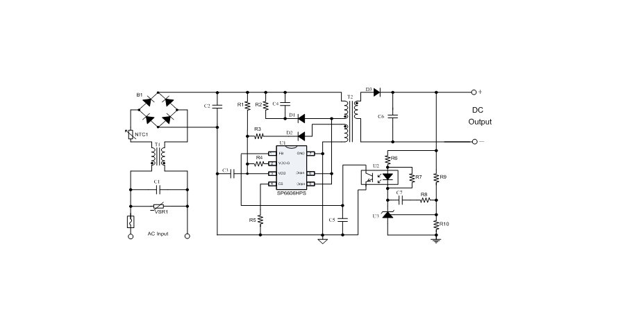 SP6606HPS在PWM模式下工作于固定頻率,這個頻率是由內部精確設定的。在空載或者輕載時,工作頻率由IC內部調整。芯片可以工作在綠色模式,以此來減小輕載時的損耗,提高整機的工作效率,SP6606HPS在啟動和工作時只需要很小的電流,可以在啟動電路中使用一個很大的電阻,以此來進一步減小待機時的功耗。芯片內置有斜坡補償電路,當電路工作于大占空比時,避免次諧波振蕩的發生,改善系統的穩定性。內置有前沿消隱時(Leading-edge blanking time),消除緩沖網絡中的二極管反向恢復電流對電路的影響。SP6606HPS采用了抖頻技術,能夠有效改善系統的EMI性能。系統的跳頻頻率設置在音頻(20KHz)以上,在工作時可以避免系統產生噪音。SP6606HPS內置多種保護,包括逐周期限流保護(OCP),過載保護(OLP),過壓保護(OVP),VDD過壓箝位,欠壓保護(UVLO),過溫保護(OTP)等,通過內部的圖騰柱驅動結構可以更好的改善系統的EMI特性和開關的軟啟動控制。