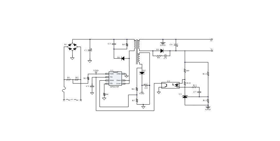 SP6658P是一顆高性能、多工作模式的PWM控制芯片。芯片可以工作在跳頻及綠色模式,以此來減小空載和輕載時(shí)的損耗,也可以工作在QR工作模式及CCM工作模式,提高整機(jī)的工作效率。SP6658P在啟動(dòng)和工作時(shí)只需要很小的電流,可以在啟動(dòng)電路中使用一個(gè)很大的電阻,以此來進(jìn)一步減小待機(jī)時(shí)的功耗。SP6658P內(nèi)置多種保護(hù),包括:輸入電壓過低保護(hù)(Brown-out),輸出電壓短路保護(hù),VDD過壓保護(hù)(OVP),VDD過壓箝位,VDD欠壓保護(hù)(UVLO),過溫保護(hù)(OTP)等。